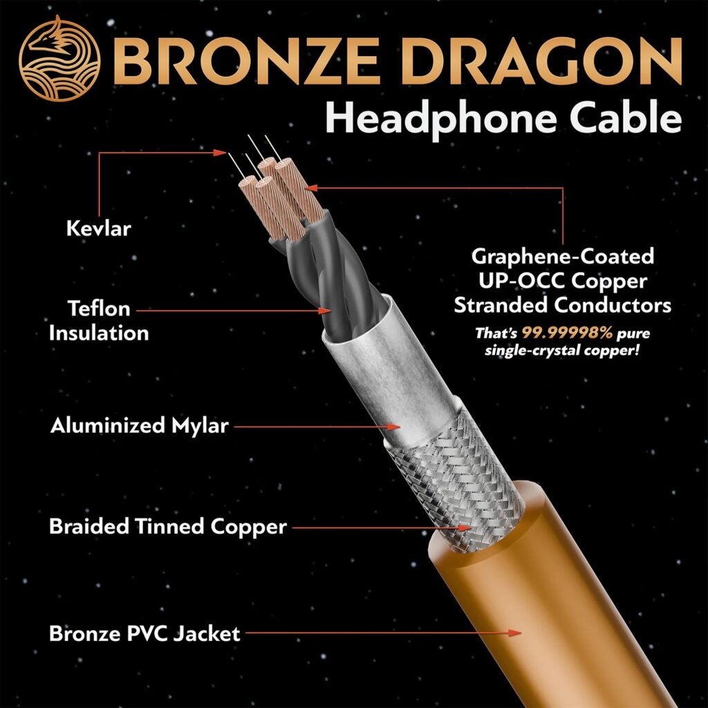 The base of the Bronze Dragon Headphone Cable is composed of OCC copper–single-crystal continuous cast copper, or Ohno Continuous Cast. The copper used in the Bronze Dragon Headphone Cable is devoid of all possible impurities that can change the coloration of the sound. Knowing that all materials have different coloration and the key to keeping the tonality consistent or slightly changing the coloration is to omit other metals or add other metals to the conductor stand, Graphene was determined to be the perfect choice. This not only improved the UP-OCC material but also changed the tonality of the Dragon UP-OCC conductor, delivering increased dynamics with a very musical flavor to the sound. The intended sonic profile of the Bronze Dragon Headphone Cable is incredibly tight and controlled, with a powerful bass response with improved dynamics, and maintained musicality.